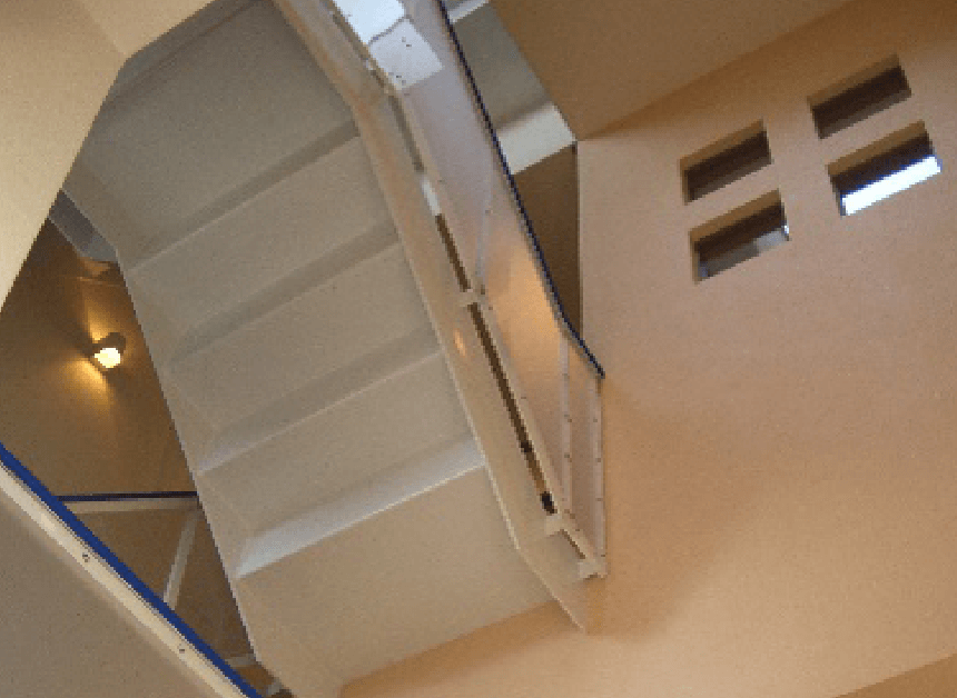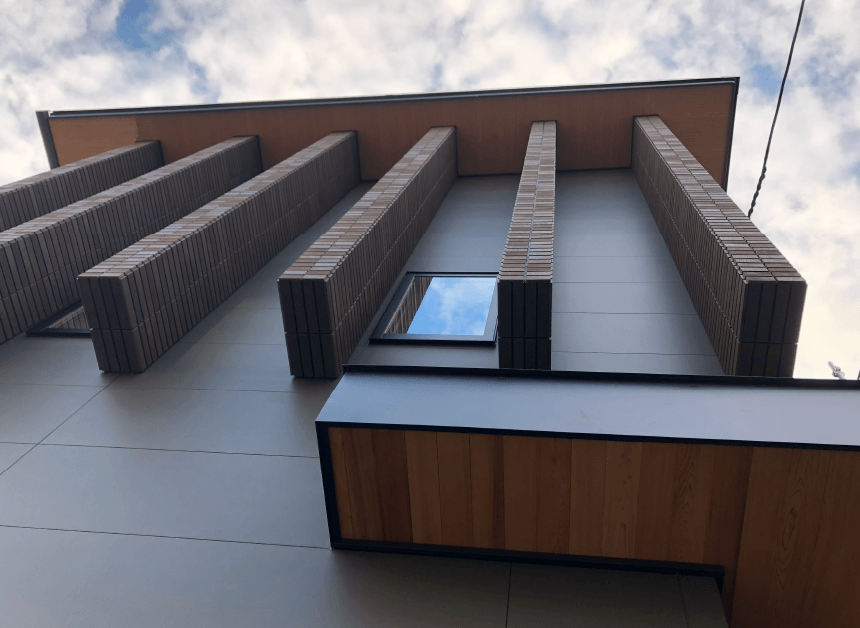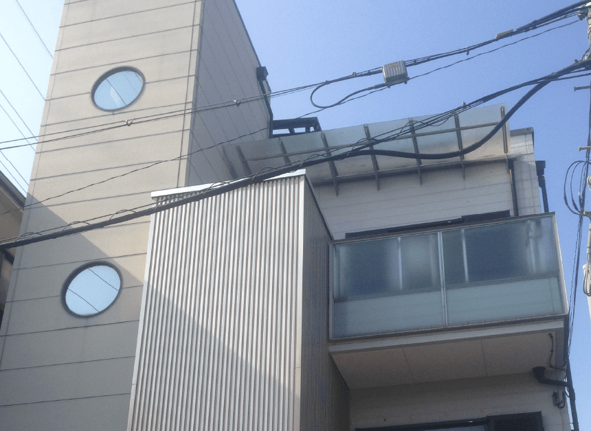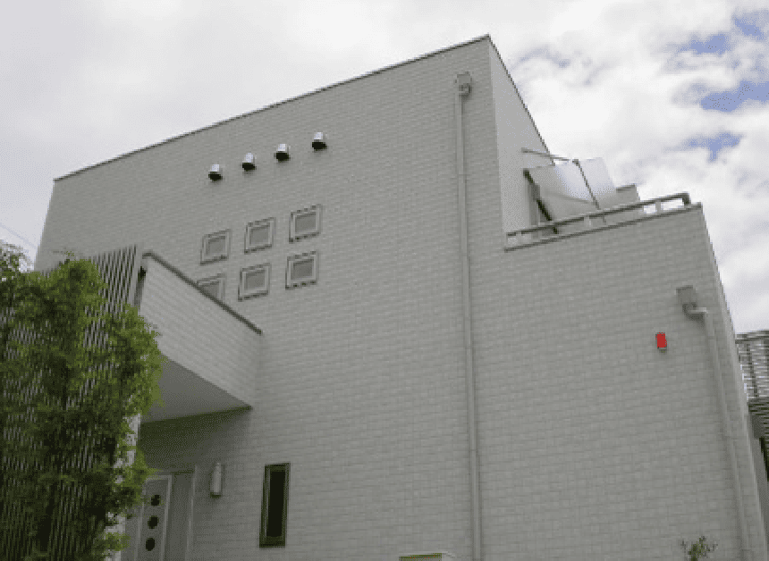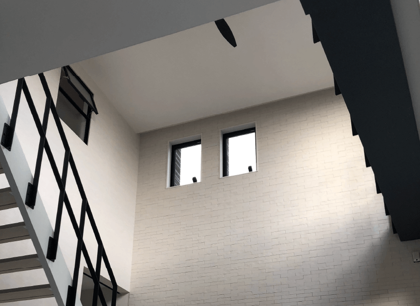 大きな開口部を設けにくく単調になりがちな西側のファサードを、小窓を連続して設置する事で建物正面の表情を演出しました。