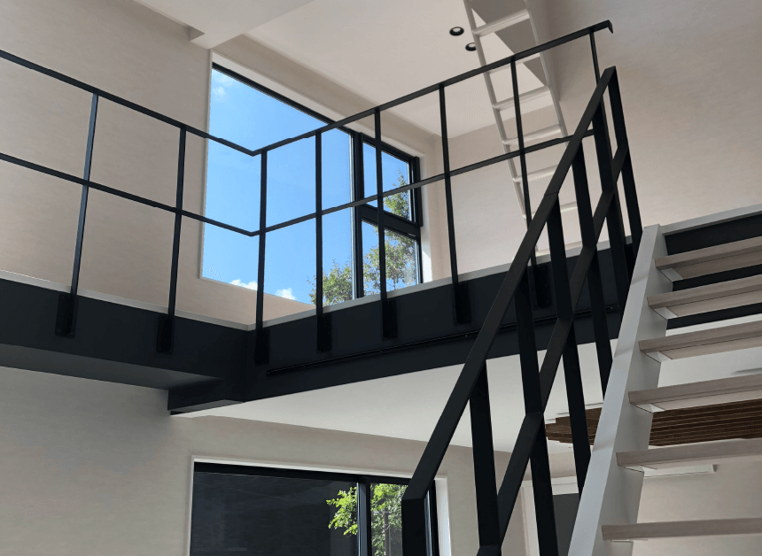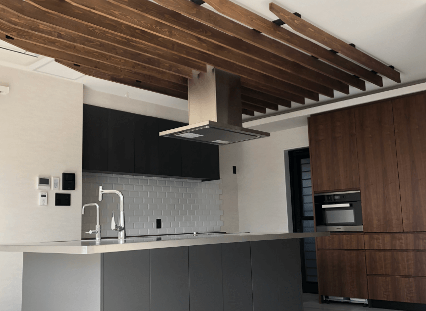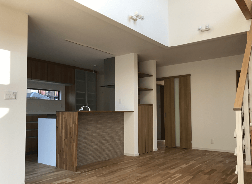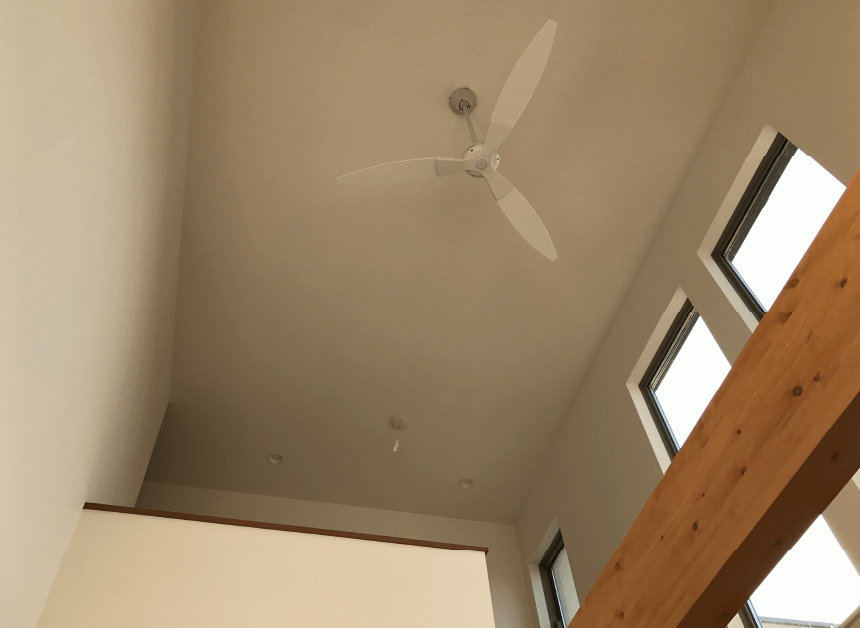 キューブタイプのローコスト住宅。リビングの吹き抜けは風の通り道であり、2階の子供部屋と夫婦を繋ぐ役割も。