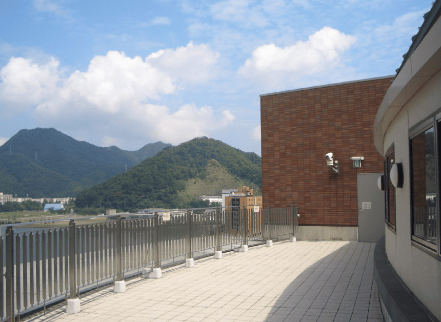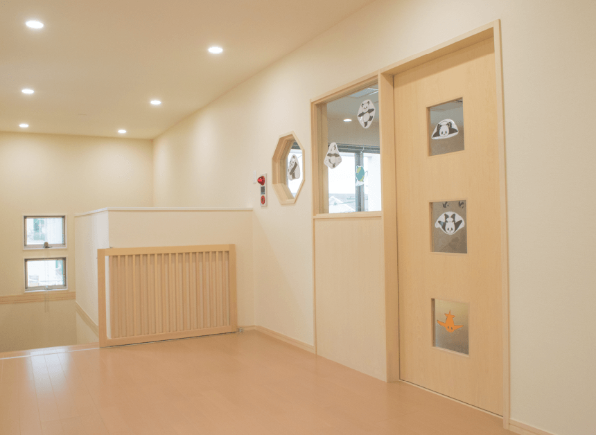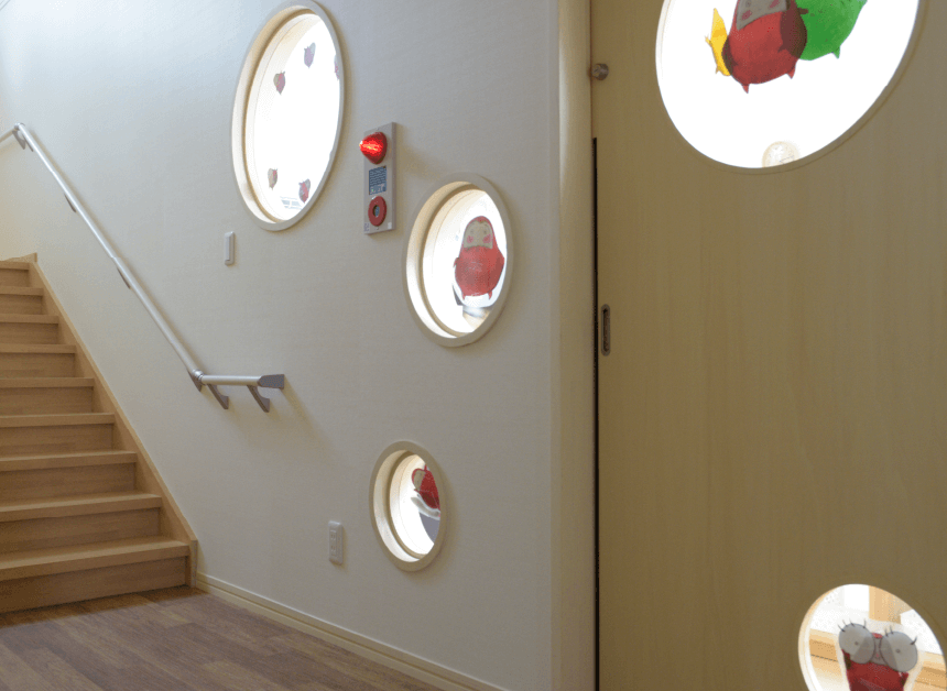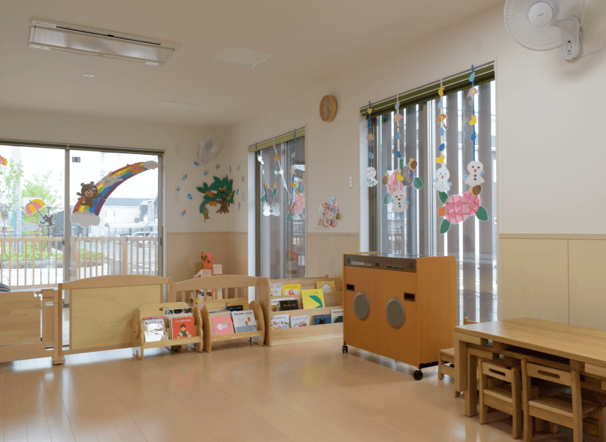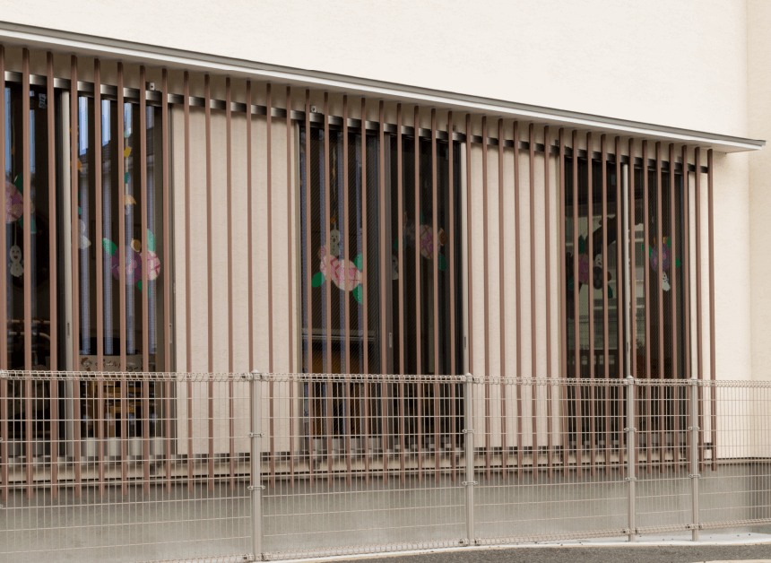 出来る限り機械的な空調設備は使わず、自然な環境で保育したいとの園の希望にこたえる為、西に面した大きな開口窓には日照調節用のルーバーを設けました。高度の低い西陽を遮る為、縦型のものを45度傾斜させています。南面には、高度の高い夏の日差しを遮る可動庇を設置しています。