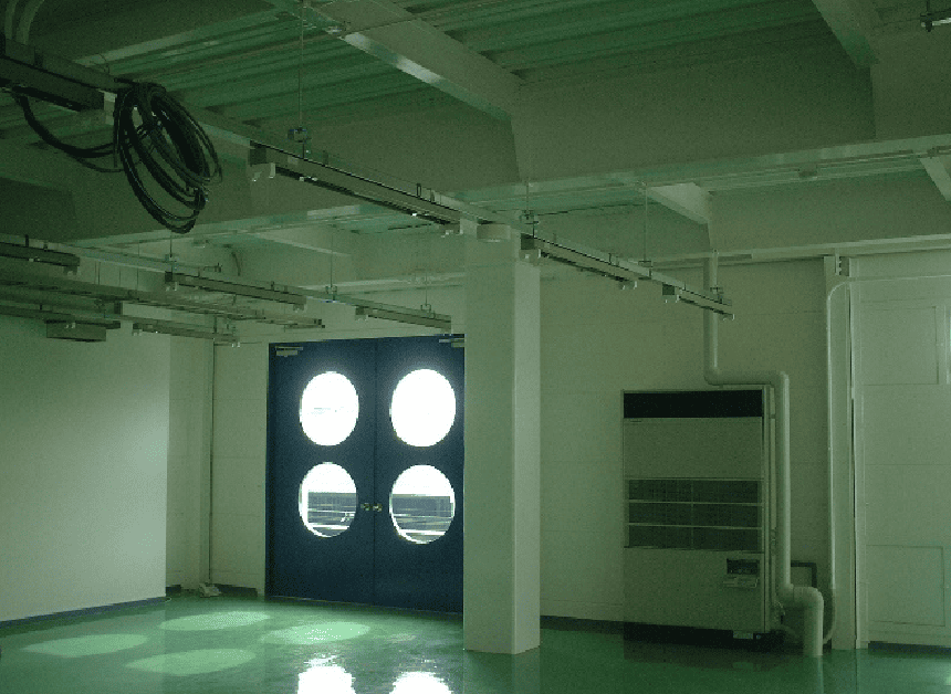 印刷機械の形状に合わせた平面計画とし、その搬入の為の開口とスリット状に設けた明かり窓がファサードの特徴です。